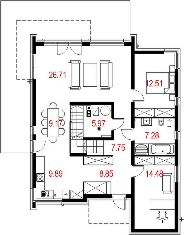 Баланс жилой площади и количества комнат всегда сложен. В данном проекте жилая площадь составляет 126,42 м², что входит в полезную площадь 144,54 м². Это означает, что почти все пространство дома выделено под жилые комнаты, а не под технические или вспомогательные помещения.