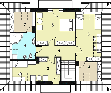 Как уже упоминалось, на втором этаже размещены 4 спальни. Такая архитектура позволяет не только комфортно проживать, но и удовлетворить потребности каждого члена семьи. Детские комнаты можно расположить рядом, родительскую спальню — отдельно с возможностью организовать здесь отдельный санузел.