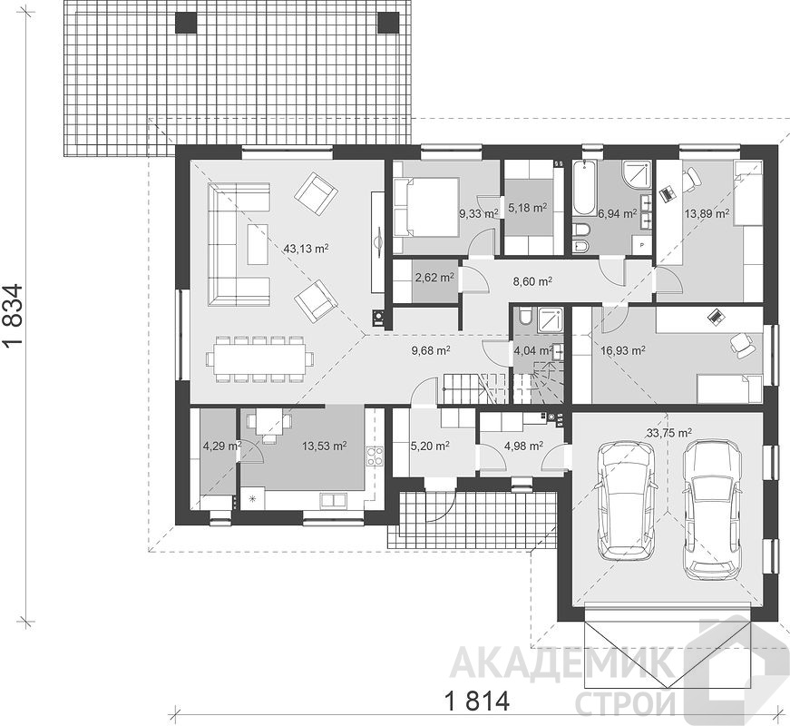 Если взглянуть на планировку этого дома от Академик Строй, можно заметить, насколько тщательно продумана каждая зона. Благодаря трем спальням, ваш дом подойдёт для семьи с двумя и более детьми или как вариант для совместной жизни нескольких поколений. Два санузла обеспечат отсутствие очередей и помогут сэкономить время.