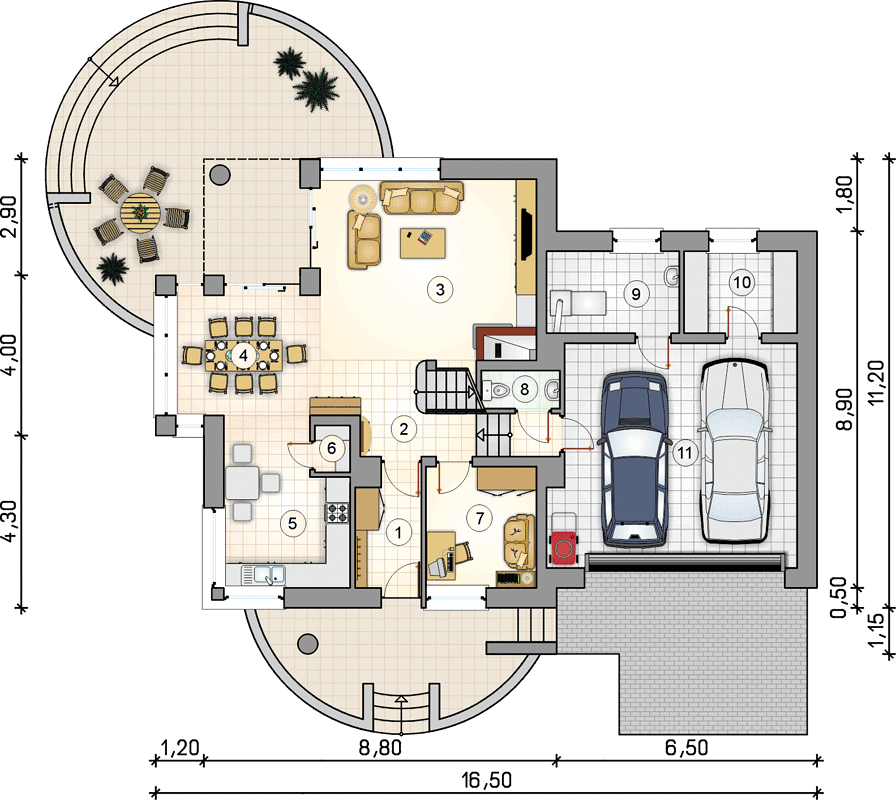 Если машина не является главным критерием комфорта, это решение делает дом легче для строительства и зачастую дешевле. А учитывая размеры и планировку, на участке всегда можно выделить удобную площадку для парковки.
