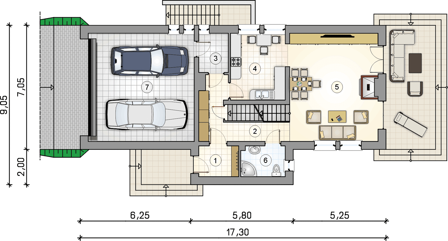 Перед тем как заказать проект или приступить к строительству, важно понимать, что для такого дома необходим участок минимальной шириной 16,05 метра и длиной 25,30 метра. Это обязательное требование для того, чтобы дом свободно разместился на участке, оставляя место для удобств — подъездных путей, зон отдыха и небольшого сада.