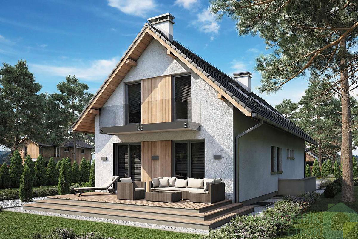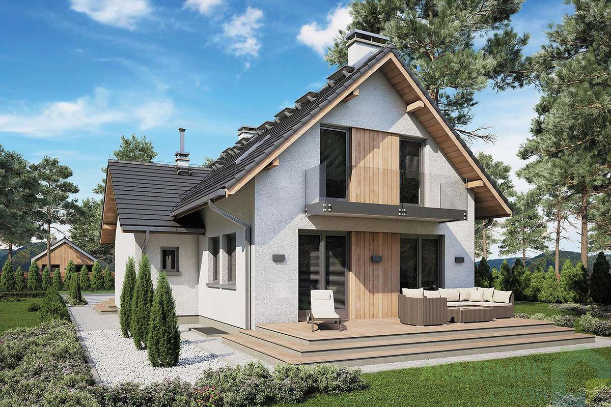 Двускатная крыша с углом наклона 42° — отличный вариант и для установки мансардных окон, увеличивающих естественное освещение второго этажа и создающих дополнитель уют.