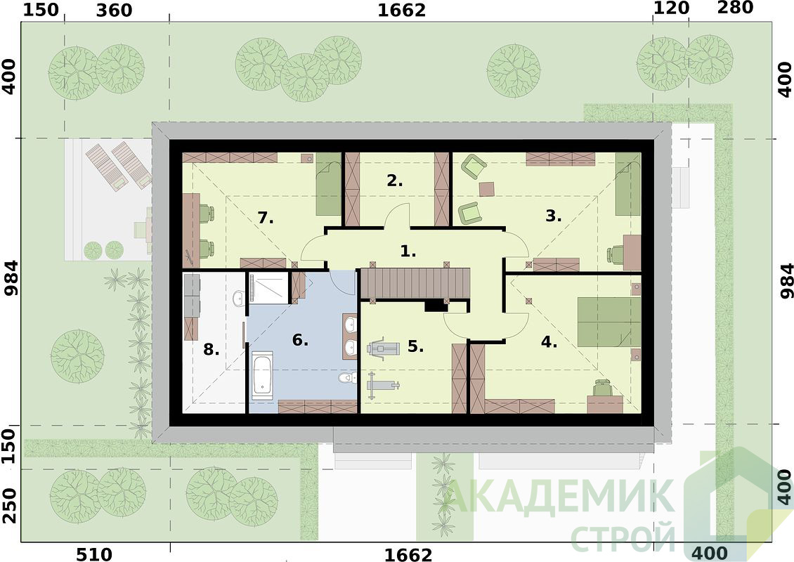 Оптимальное расположение дома на участке способствует эффективному использованию пространства и обеспечивает комфортный доступ к зданию с главной дороги. Кроме того, остающееся пространство позволяет создать гараж или навес отдельно от жилого дома, если это потребуется.