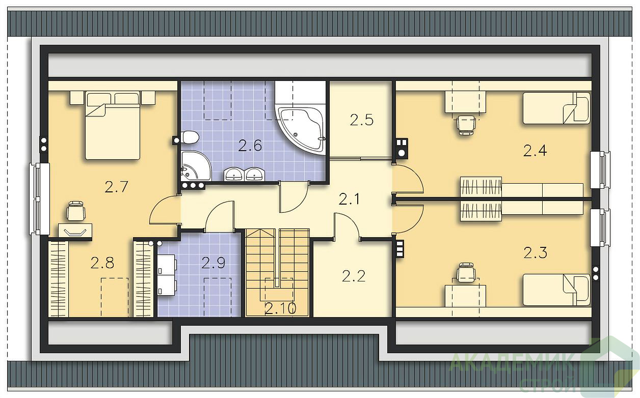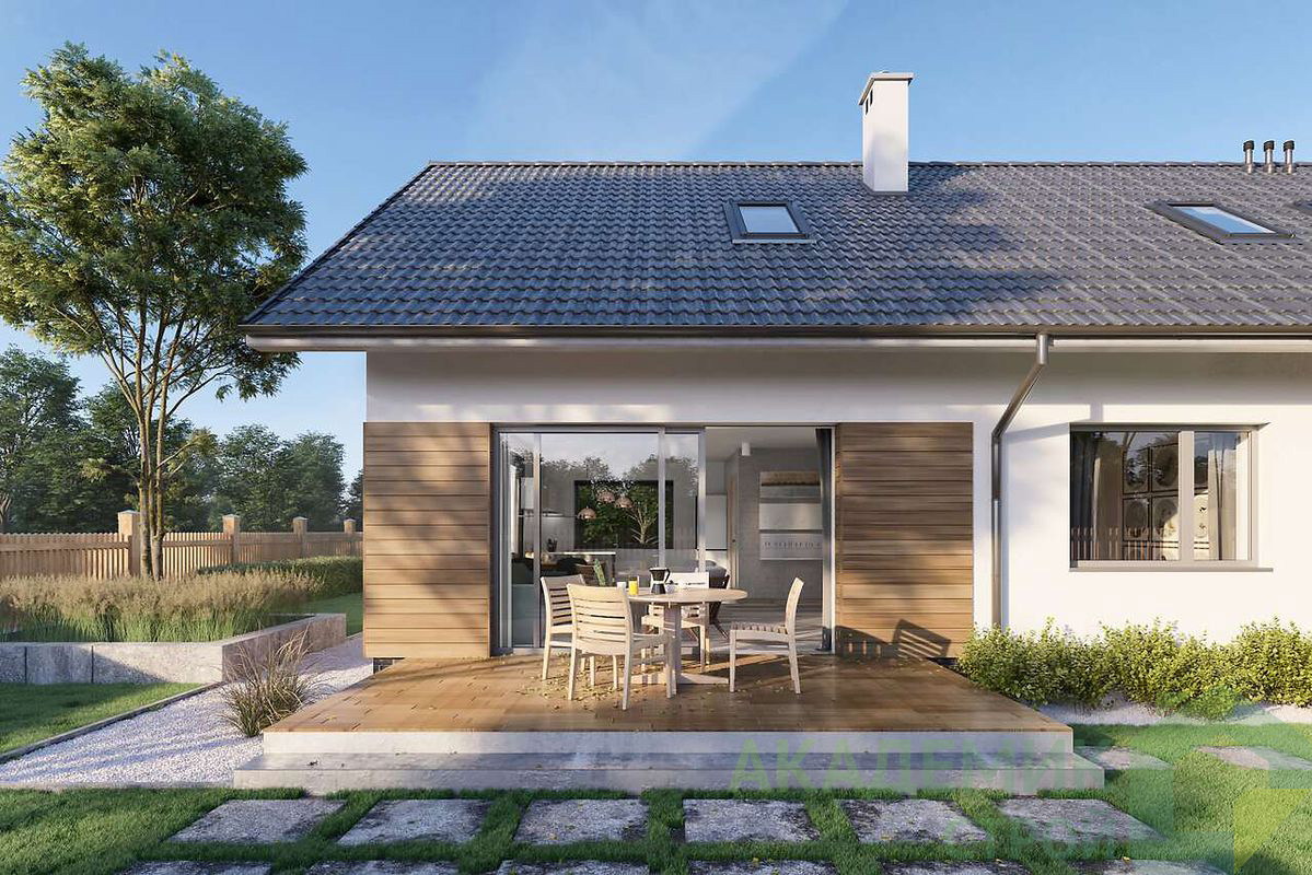 Одним из ключевых элементов в дизайне дома служит тип крыши — двускатная крыша с углом наклона 35°. Именно такой угол наклона обеспечивает хорошее стечение осадков и препятствует скоплению снега зимой, что особенно актуально для регионов с холодным климатом и активными снежными зимами. Двускатная крыша — классический и проверенный способ надежно защитить дом и жилище от атмосферных воздействий.