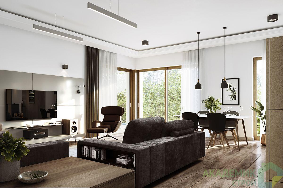 Жилая площадь составляет 123,8 м², что говорит о наличии достаточно комфортабельных комнат для отдыха и личного пространства. В доме запроектированы три спальни, что идеально подходит как для семьи с детьми, так и для гостей. Кроме того, предусмотрено два санузла, что повышает удобство и функциональность дома в ежедневной эксплуатации.