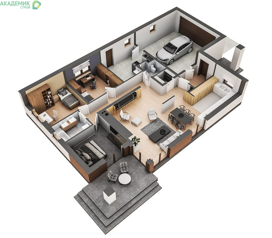 Одноэтажный дом планируется с учетом будущих потребностей семьи. Например, одну из спален можно легко превратить в кабинет или игровую. Просторная общая зона гостиной с кухней может быть модернизирована и разделена при необходимости. Наличие удобных технических помещений поможет содержать дом в порядке и удобстве.
