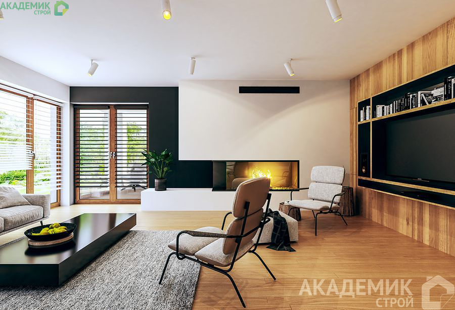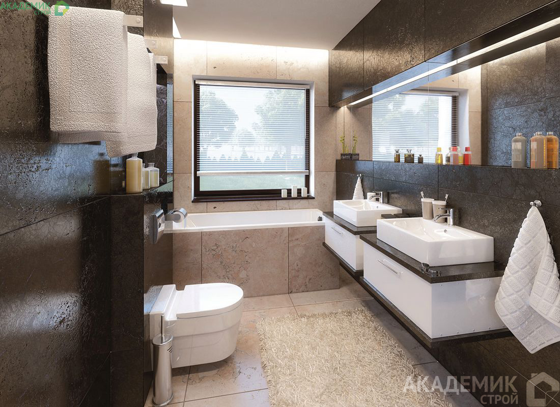 Стандартная высота потолков, согласно проекту, дает простор для внедрения систем вентиляции и кондиционирования, а также установки современных осветительных приборов. Благодаря двускатной крыше с углом 30°, пространство мансарды можно использовать для установки инженерных коммуникаций или дополнительного места для хранения.