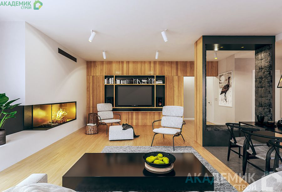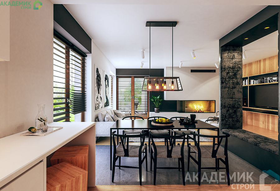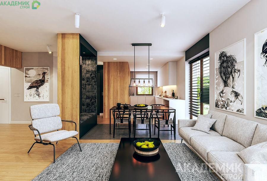 Просторная гостиная объединена с кухней и столовой, создавая общее пространство для совместного времяпрепровождения и приема гостей. Такой открытый план позволяет максимально использовать свет и естественное освещение, а также сделать интерьер более современным и уютным.
