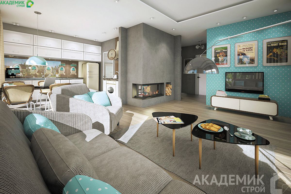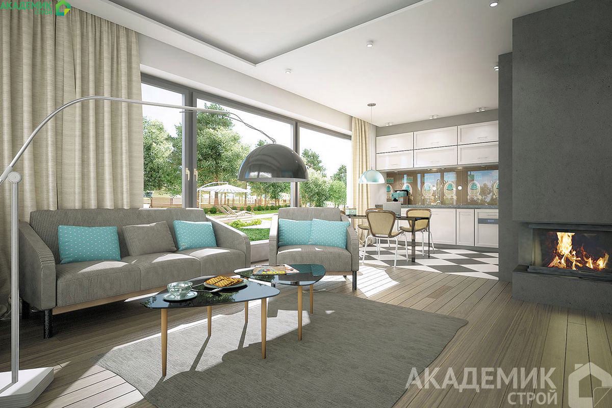 - Гостиная с естественным освещением. Благодаря большой площади полезных 84,1 м², в доме легко расположить просторную гостиную, что немаловажно для совместного времяпровождения.