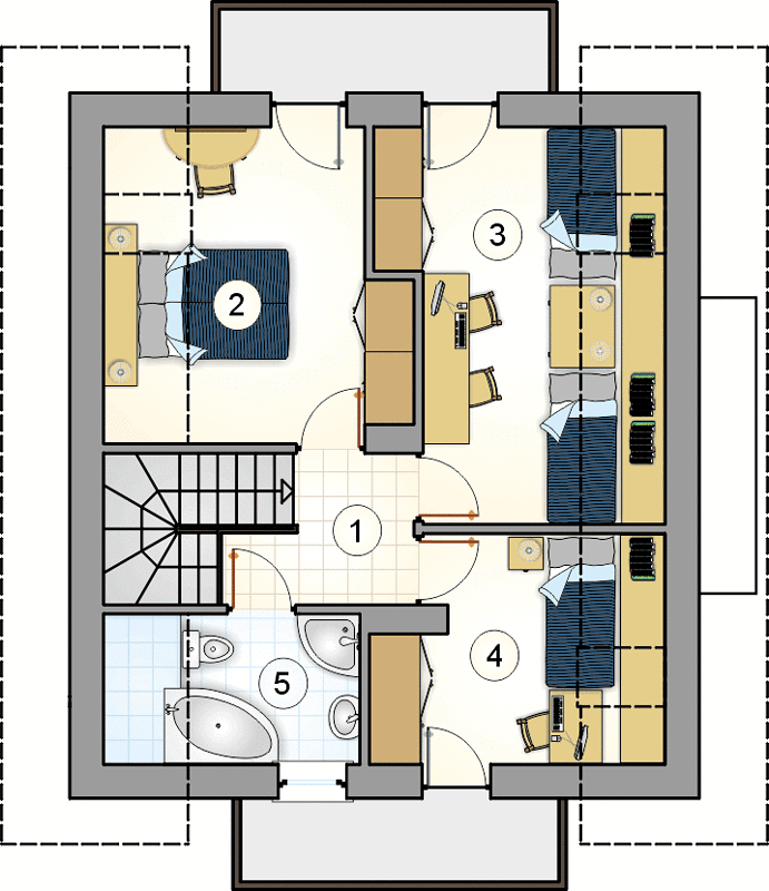 Первый этаж занимает общественная зона – гостиная, кухня-столовая и санузел. Это позволяет свободно принимать гостей и проводить время всей семьёй. Второй этаж – это личное пространство с тремя спальнями и дополнительным санузлом, что помогает сохранить тишину и спокойствие в вечернее время.