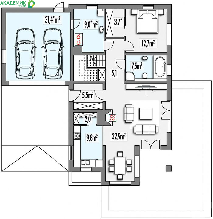 - Просторные жилые зоны — гостиная, столовая и кухня сформированы таким образом, чтобы совместить удобство и свободу перемещения