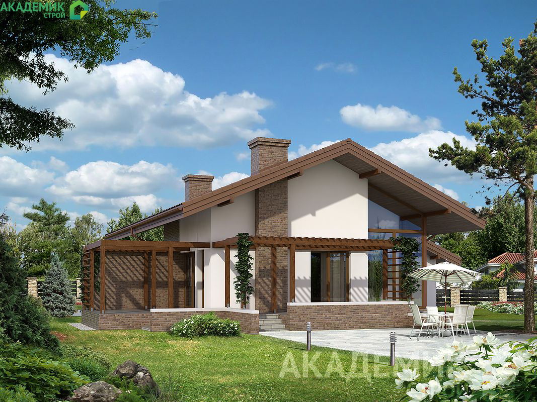 Крыша в проекте двойная (двускатная) с ухом наклона 20°. Параметры крыши соответствуют не только эстетической, но и практической части дома: