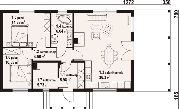 Одноэтажный дом размером 14х9 метров вмещает в себя удивительно функциональную планировку. Учитывая, что в нем всего один этаж, каждая комната связана со всеми остальными без лишних переходов. Важнейшими комнатами здесь выступают две спальни и один санузел — оптимальное количество для семьи из трех-четырех человек.
