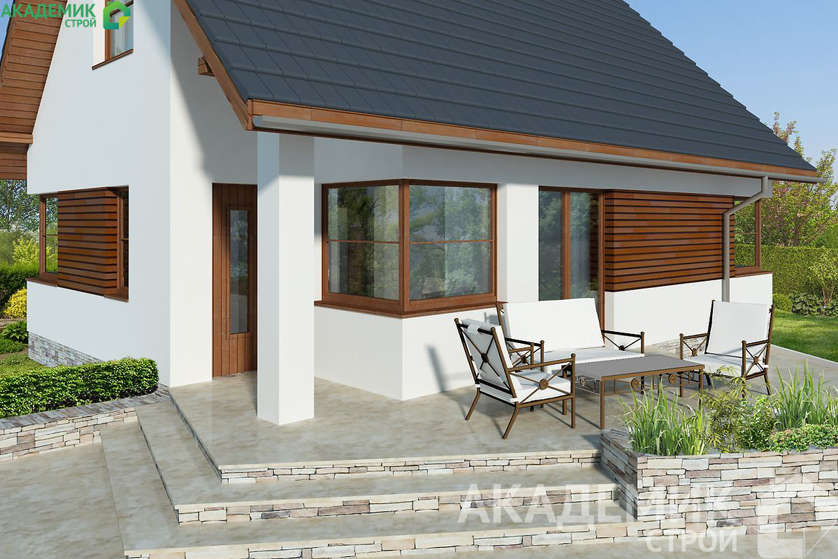 Важной характеристикой дома является его компактность, позволяющая сэкономить место на участке, при этом продуманная планировка обеспечивает высокое качество жизни. Дом построен в два этажа, что предполагает разделение зон на ночные и дневные, создавая максимальный комфорт для жильцов.