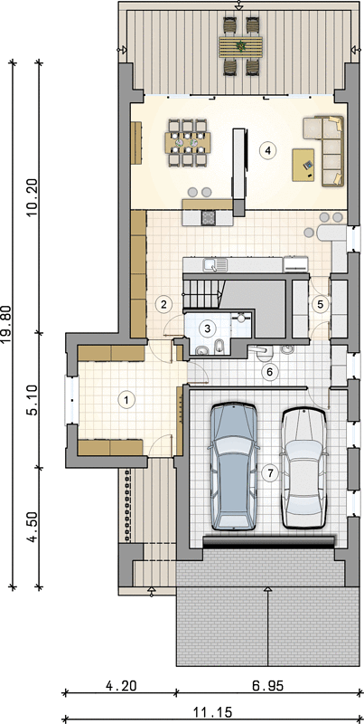 Первое, что необходимо рассмотреть при выборе проекта — это габариты и полезная площадь. В данном случае размеры дома 11х20 м и полезная площадь — 221.8 м². Что это даёт?Оптимальные размеры для городской застройки
