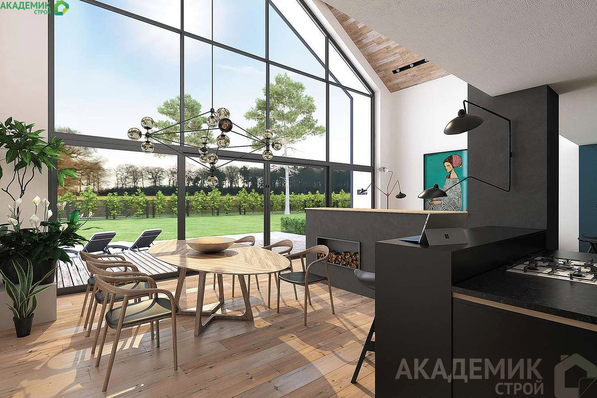 Просторная гостиная объединена с кухней и столовой зоной, что создаёт эффект открытого пространства и визуально расширяет границы комнат. Это решение не только модное, но и функциональное: большие окна и правильное расположение помогут поддерживать прохладу летом и затраты на отопление зимой. Кроме того, такая планировка способствует семейному общению и удобна для приёма гостей.Высота, тип крыши и дополнительные технические параметры