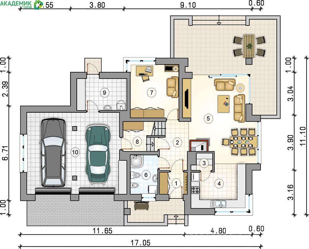 Размеры дома 17 на 11 метров накладывают определенные ограничения и требования к участку. Минимальные рекомендуемые размеры – 25,05 метров по ширине и 19,10 метров по длине – позволяют создать комфортную зону не только для дома, но и для прилегающих построек, садовых дорожек, зон отдыха и детских площадок.