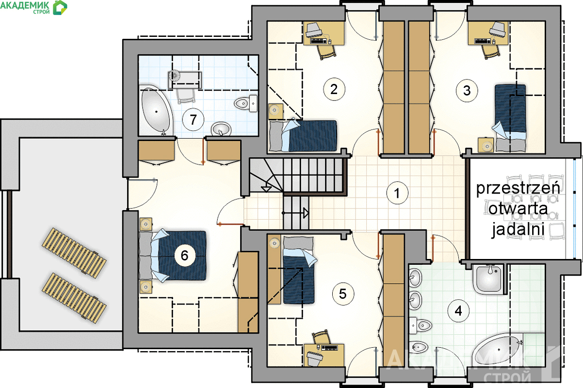 Второй этаж отведен под спальные комнаты. Благодаря пяти и более спальням члены семьи получают возможность приватности и покоя. Высота аттиковой стены 1.03 м делает второй этаж более просторным, позволяя эффективно использовать полезный объем мансарды и обеспечить комфортные условия под крышей.