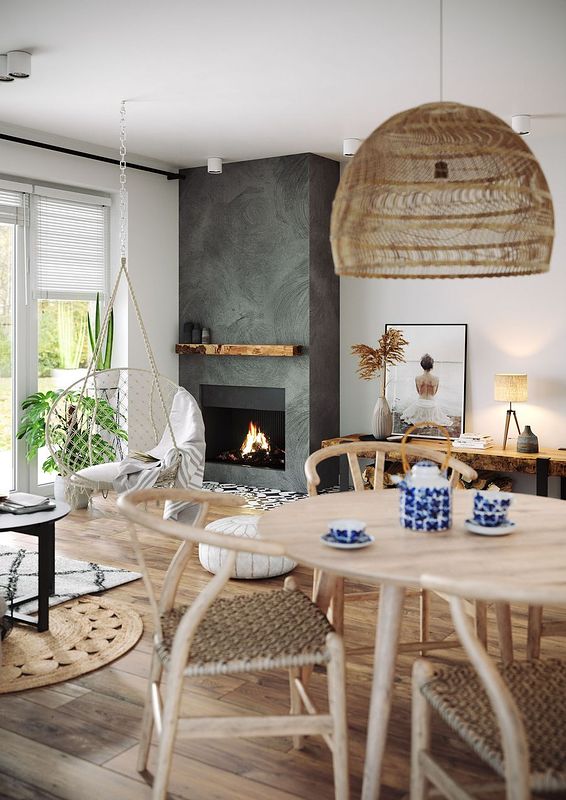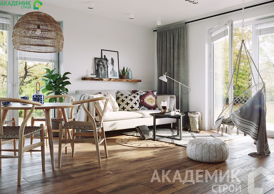 - Гостиная, которая гармонично переходит в кухню-столовую, создавая единое, просторное пространство;