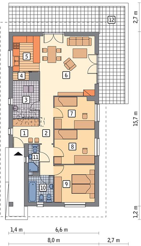 Размеры дома по фасаду – 8 метров и по глубине – 16 метров. Благодаря этим параметрам проект легко впишется даже на сравнительно узкий участок, минимальная ширина которого должна быть не менее 16,2 м, а длина – 23,9 м. Это делает дом достаточно универсальным для большинства типов пригородных или сельских территорий.
