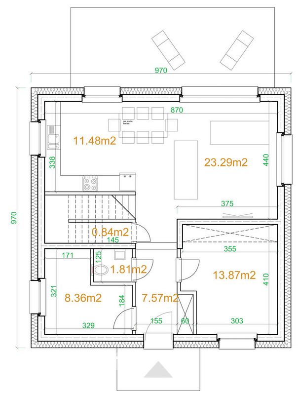 - Оптимальный размер для участка. Дом занимает площадь застройки в 94,09 м² и при этом оставляет достаточно места для хозяйственных нужд участка.