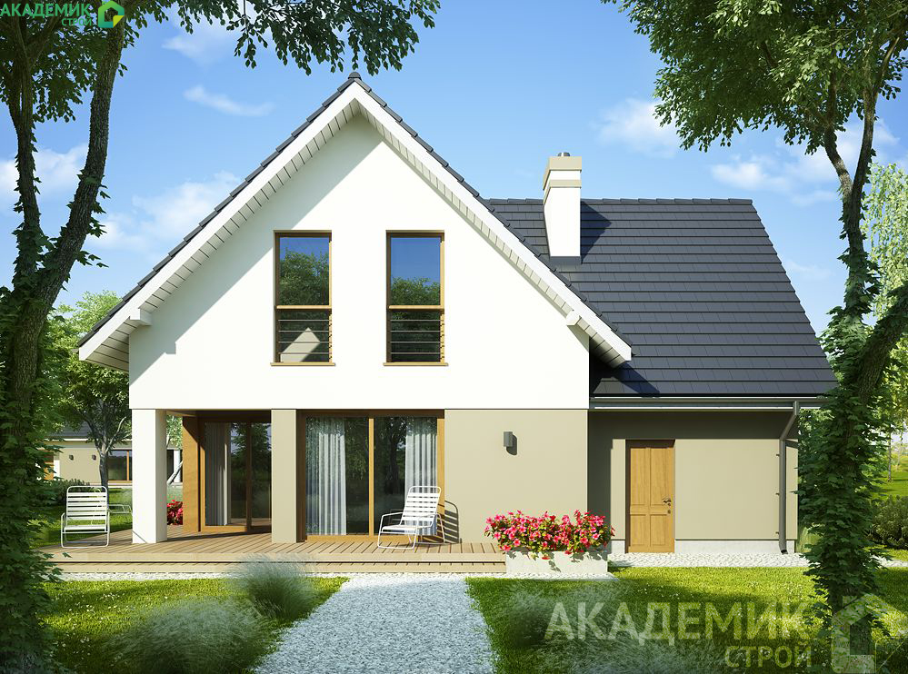 Двускатная крыша с углом наклона в 44° обеспечивает не только хороший внешний вид, но и возможность использования чердачного пространства. При необходимости здесь может быть устроен небольшой склад для хранения сезонных предметов или даже дополнительна техническая комната.