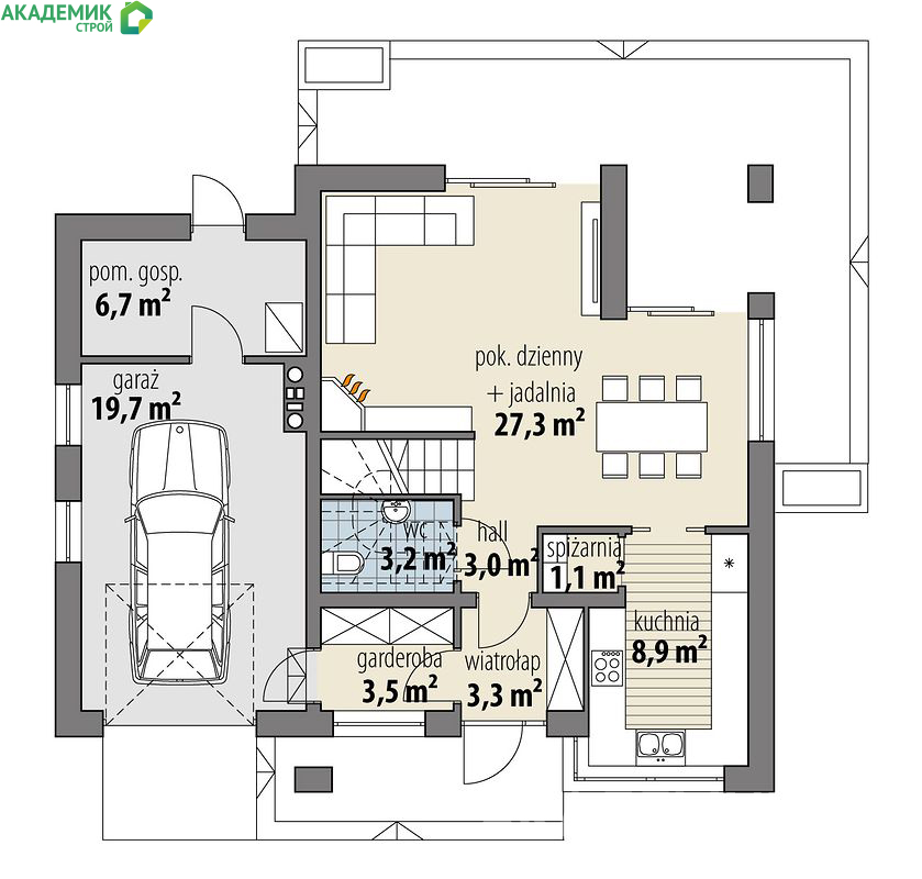 Для строительства этого дома требуется минимальный участок шириной 19,7 м и длиной 18,2 м. Это позволяет планировать участок с учетом организации следующих элементов: