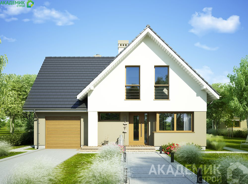 Высота дома в 8 метров придает зданию экспрессивный силуэт, не утяжеляя его и позволяя хорошо вписаться в различные архитектурные окружения. Двускатная крыша с углом наклона 44° является классическим решением для регионов с выраженными сезонными изменениями климата. Такой уклон является оптимальным для эффективного стока осадков, безопасного накопления снега и обеспечения долговечности кровельного покрытия.