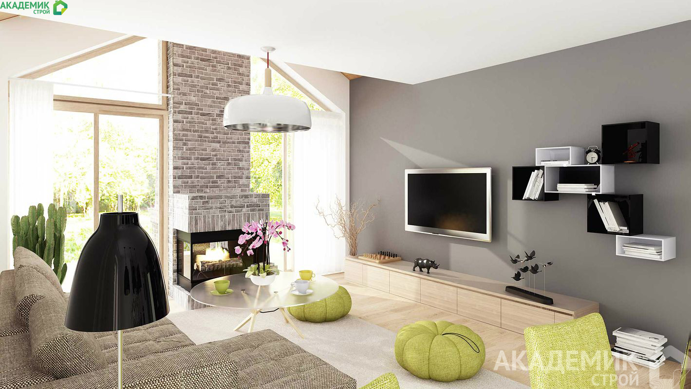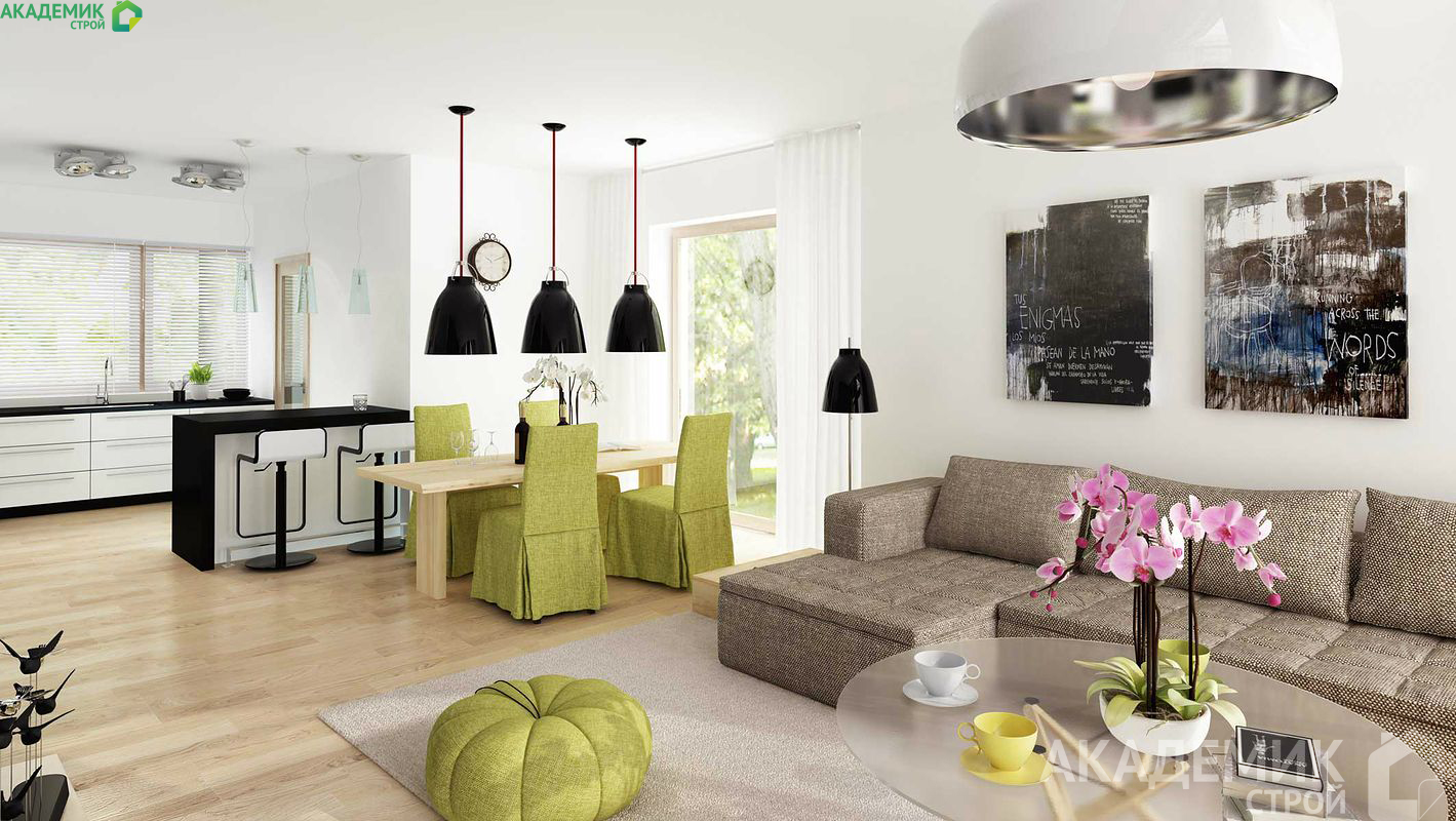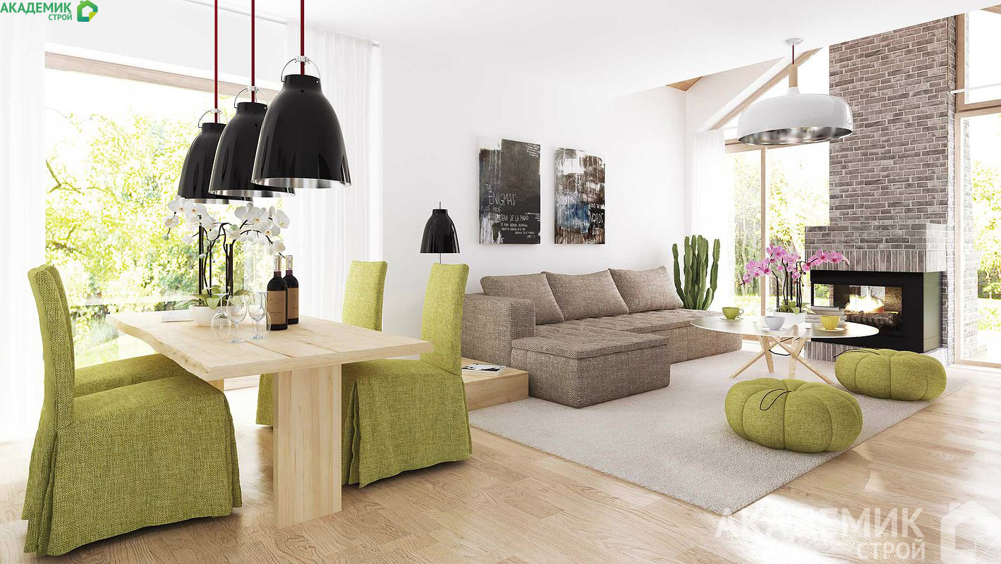 - Гостиная с большой площадью и выходом на участок — место, где собирается вся семья вечером.