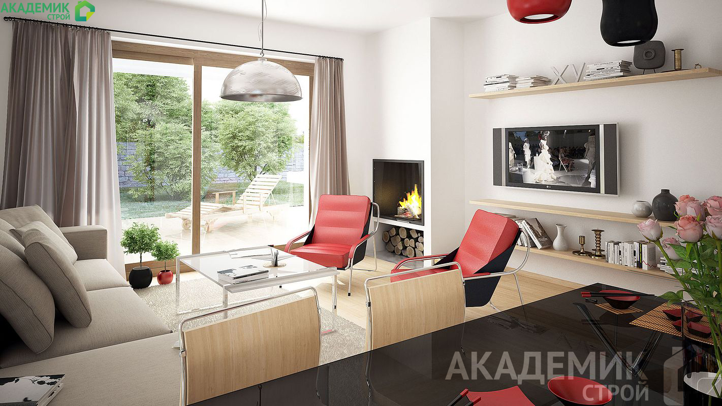 - Гостиная зона: просторное пространство с естественным освещением и выходом на участок.