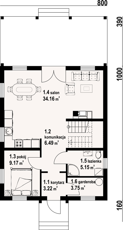 - Первый этаж: просторная гостиная, совмещённая с кухней и столовой, одна спальня или кабинет, гостевой санузел, техпомещения.