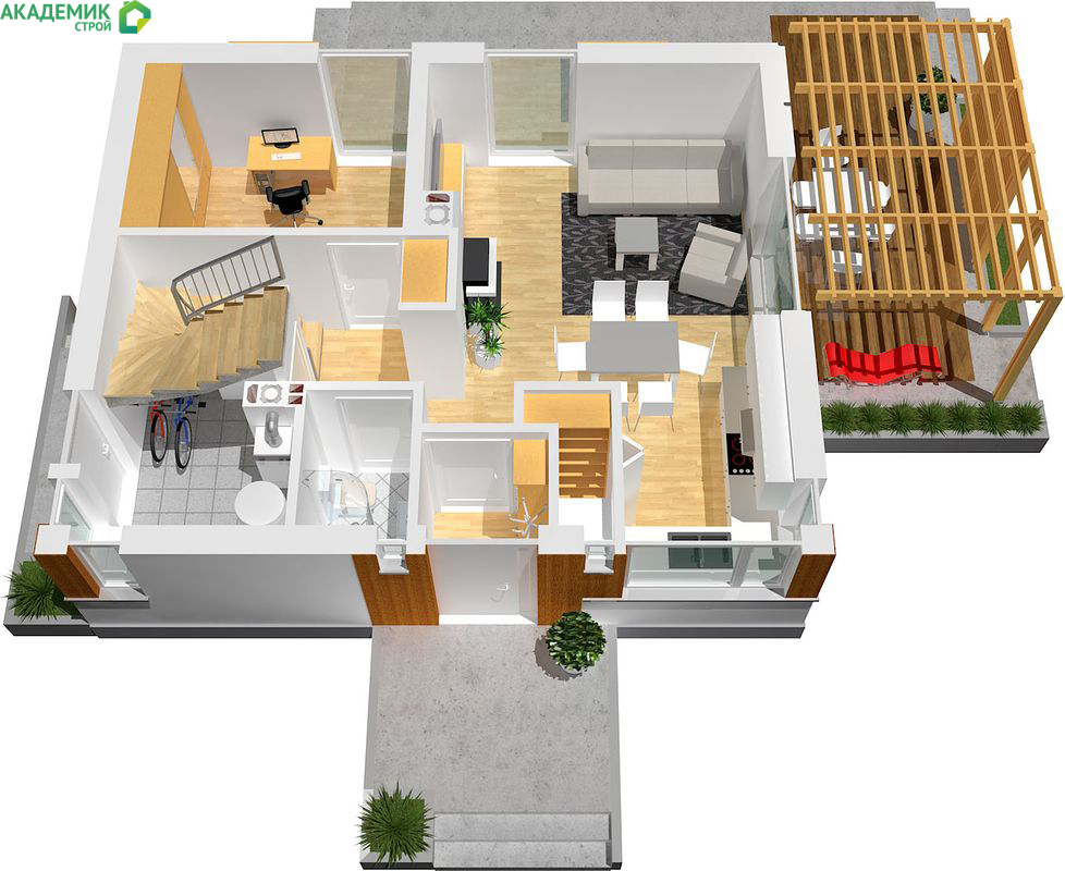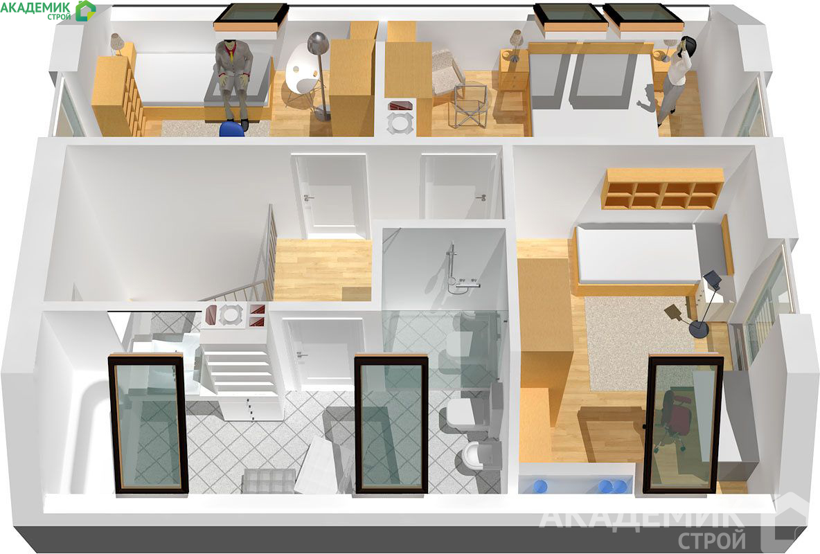 - Рациональное использование площади. Небольшая площадь застройки и большая полезная площадь позволяют разместить все необходимые комнаты без ощущения тесноты;