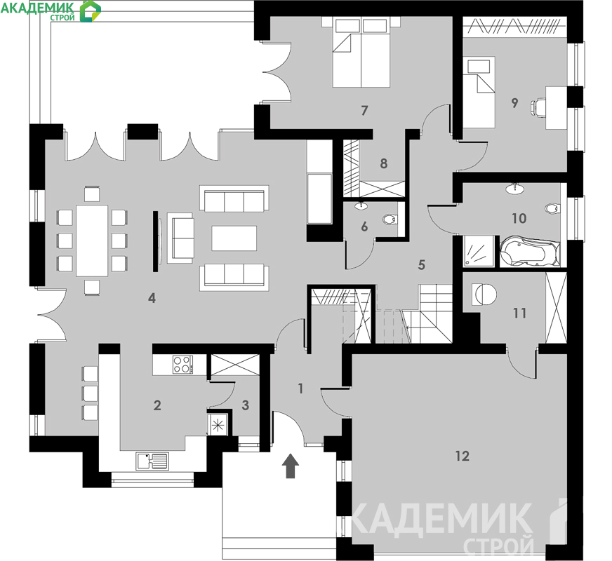 Для комфортного проживания большой семьи крайне важна грамотная планировка, которая позволит удобно организовать пространства общего и личного пользования, а также технические и хозяйственные зоны. В данном проекте заложено 5 и более спален, что идеально подходит для семьи из нескольких поколений или для тех, кто хочет иметь гостевые комнаты и рабочие кабинеты.