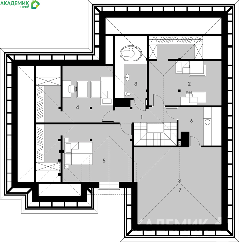 - Гибкость планировки. Способность размещать более 5 спален – это универсальное решение для разных по составу семей, включая большие семьи, семьи с пожилыми родителями или гостевые.