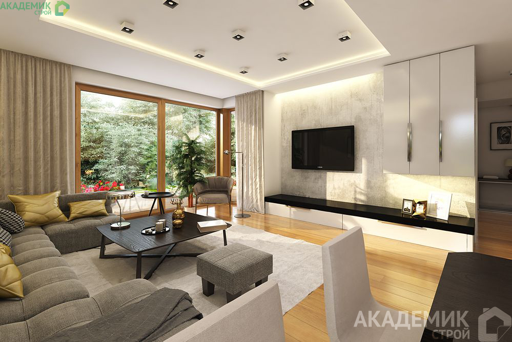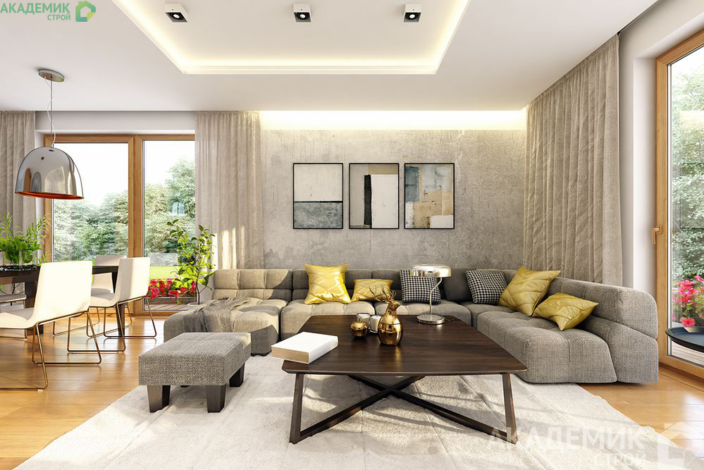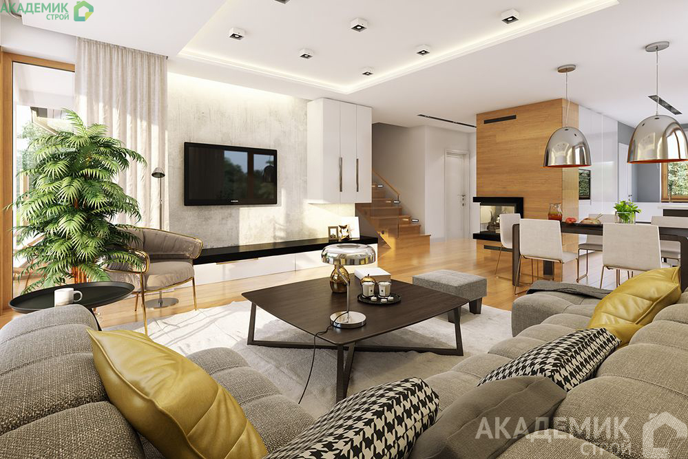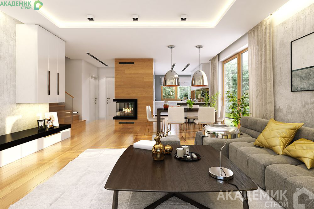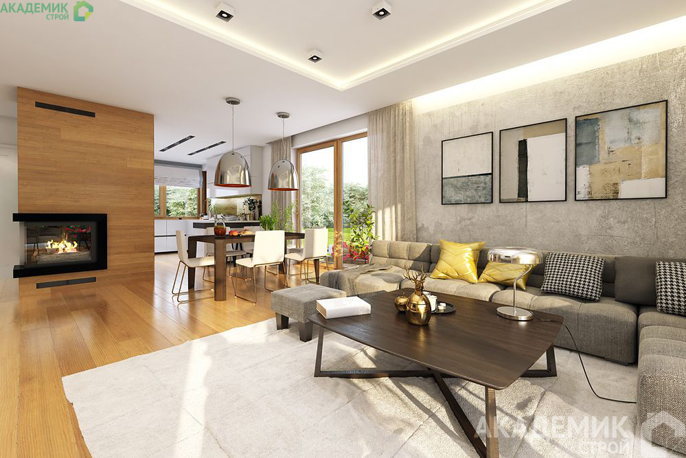- Просторная гостиная, объединенная с кухней и столовой зоной, что создает эффект открытого пространства и делает дом более светлым и просторным.