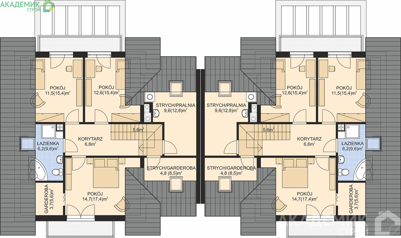 Площадь крыши почти равна площади жилых этажей — 182,9 м², что обусловлено особенностями двускатной конструкции. Такая крыша создает просторное чердачное помещение, которое можно впоследствии использовать как дополнительную зону хранения либо мансарду.