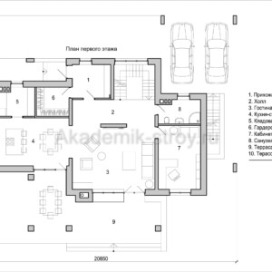 Такие габариты дома позволяют удачно расположить как жилые помещения, так и технические, а также создать благоприятную атмосферу уюта и современного комфорта. В условиях плотной застройки участок не обязательно должен быть слишком большим, что часто актуально для пригорода и загородных коттеджных посёлков.