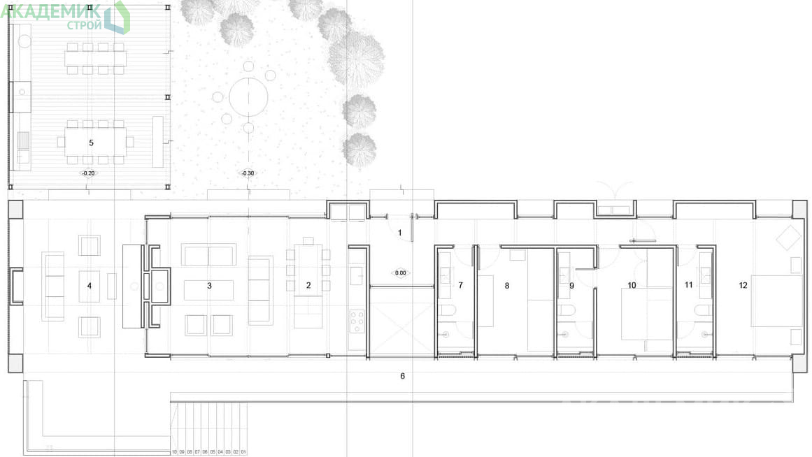 Габариты дома – 31 метра в длину и 6 метров в ширину. Эти размеры подразумевают вытянутую форму здания, что в свою очередь требует особого планировочного решения. Одноэтажный формат с одной длинной стеной позволяет максимально рационально использовать пространство, выделяя зоны для отдыха, сна и санитарных узлов.