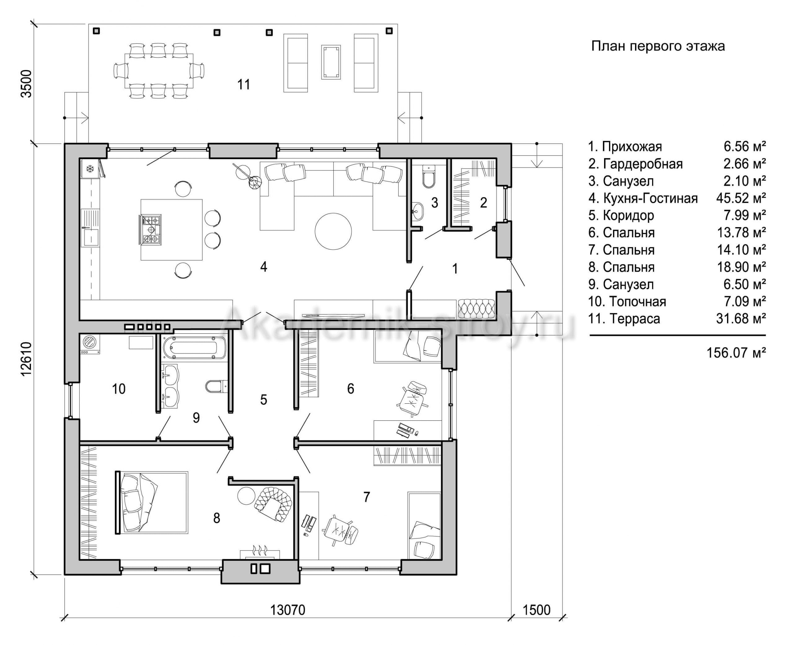 Строительство одноэтажного дома размером 13х13 с площадью около 156 квадратных метров – это оптимальное вложение средств для семейного жилья средней стоимости. Экономия достигается благодаря простоте конструкции, отсутствию второго этажа, снижению затрат на строительство лестниц и сложных систем вертикальных коммуникаций.
