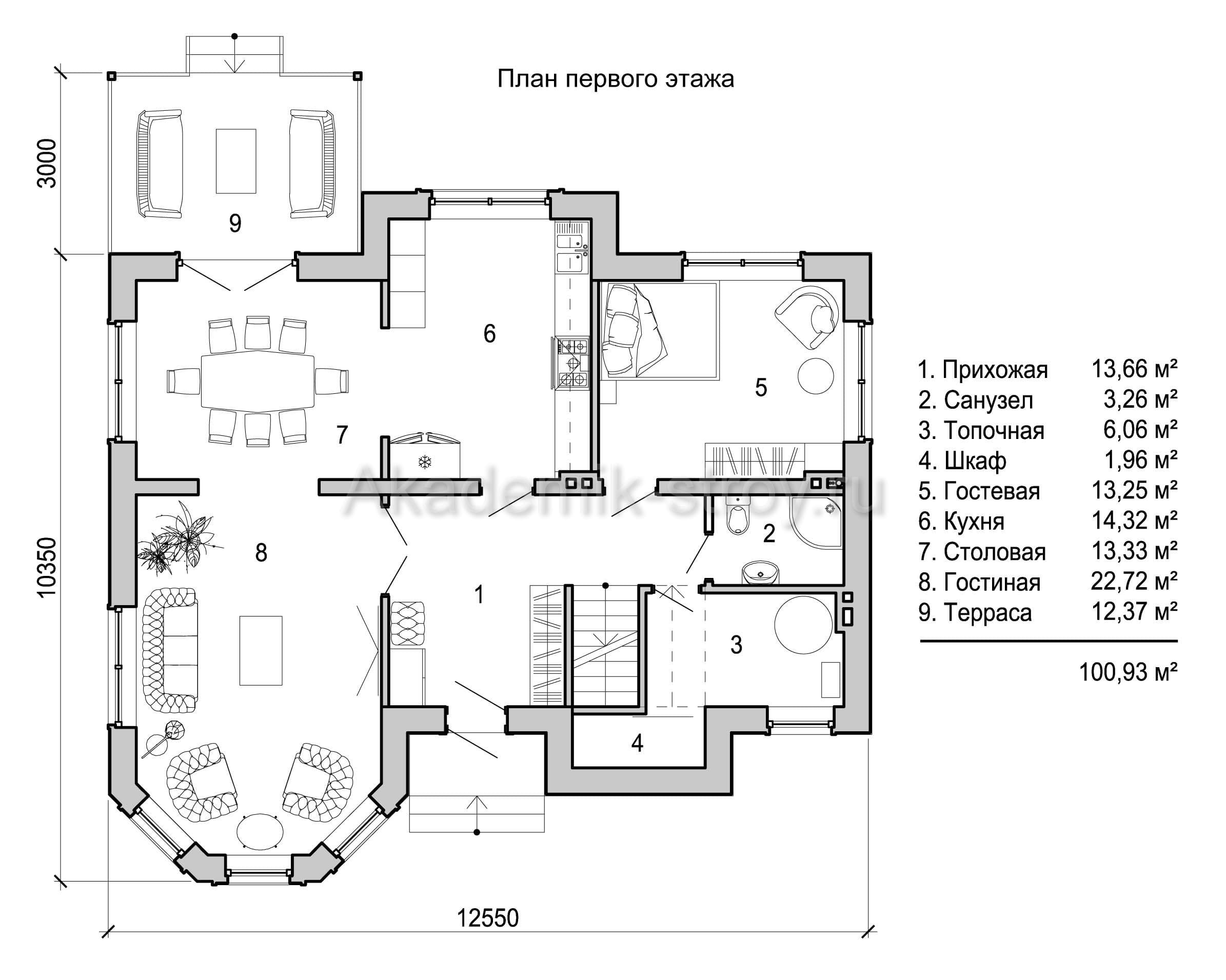 Первый этаж — это «сердце» дома, где собирается вся семья и принимаются гости. В доме 11х13 м площадью 186,14 м2 обычно выделяются следующие зоны: