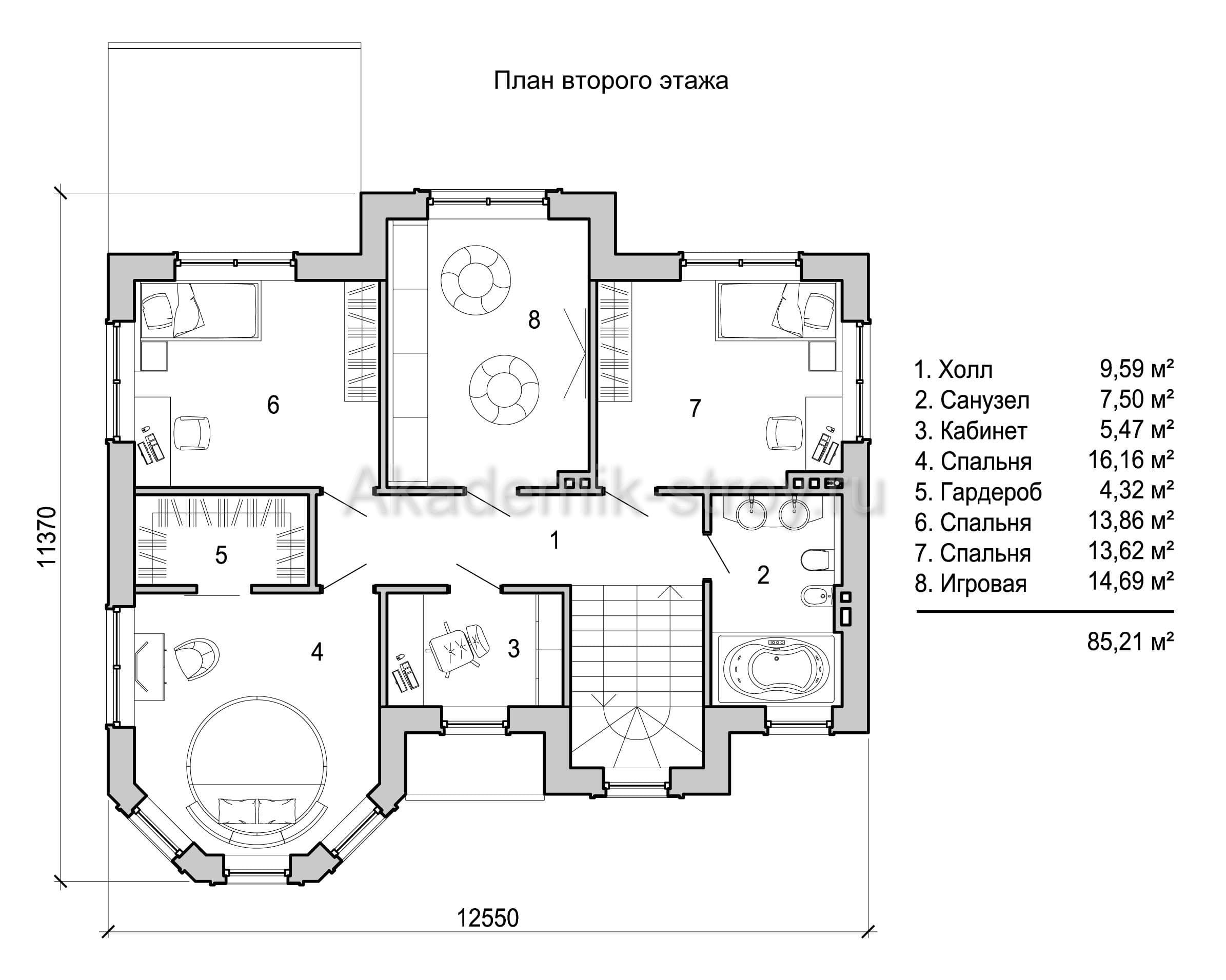 Второй этаж предназначен преимущественно для отдыха и приватности. В доме предусмотрено 3 спальни, что делает такой проект идеальным для семей с детьми или тех, кто принимает у себя гостей. Обычно планировка второго этажа включает: