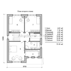 На втором этаже размещаются три спальни, каждая из которых может быть различной площади и назначения — от комнаты ребенка до мастер-спальни родителей с отдельной гардеробной. Такие условия позволяют обеспечить комфортное пребывание в доме для всех членов семьи, каждому выделить личное пространство.