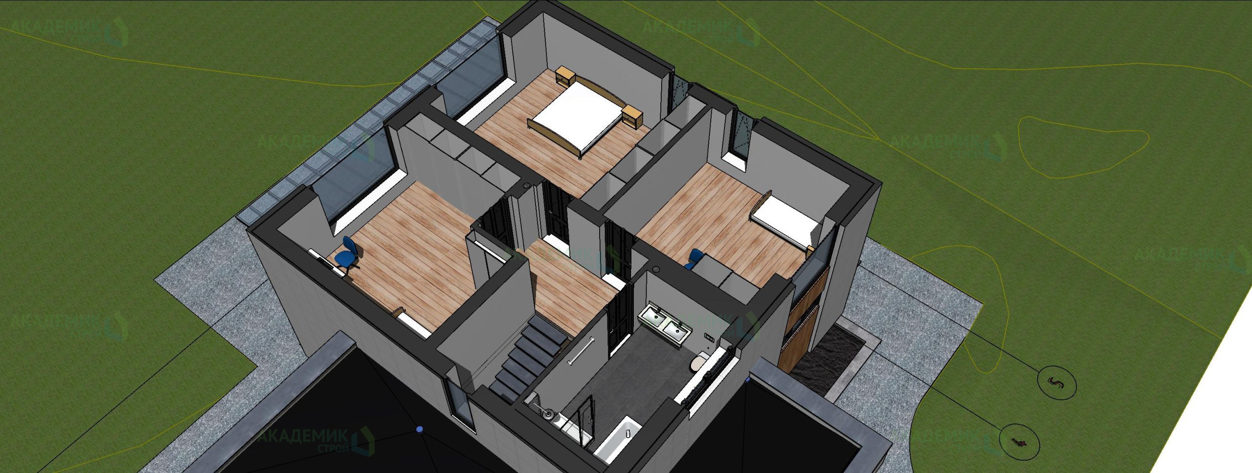 Дом ВС-129 спроектирован с четырьмя отдельными спальнями, что обеспечивает личное пространство каждому члену семьи. Наличие двух санузлов решает проблемы бытового комфорта и экономит время по утрам и вечерам, когда дом полон жителей. Современные системы сантехники и продуманная логистика коммуникаций делают дом максимально удобным для проживания.