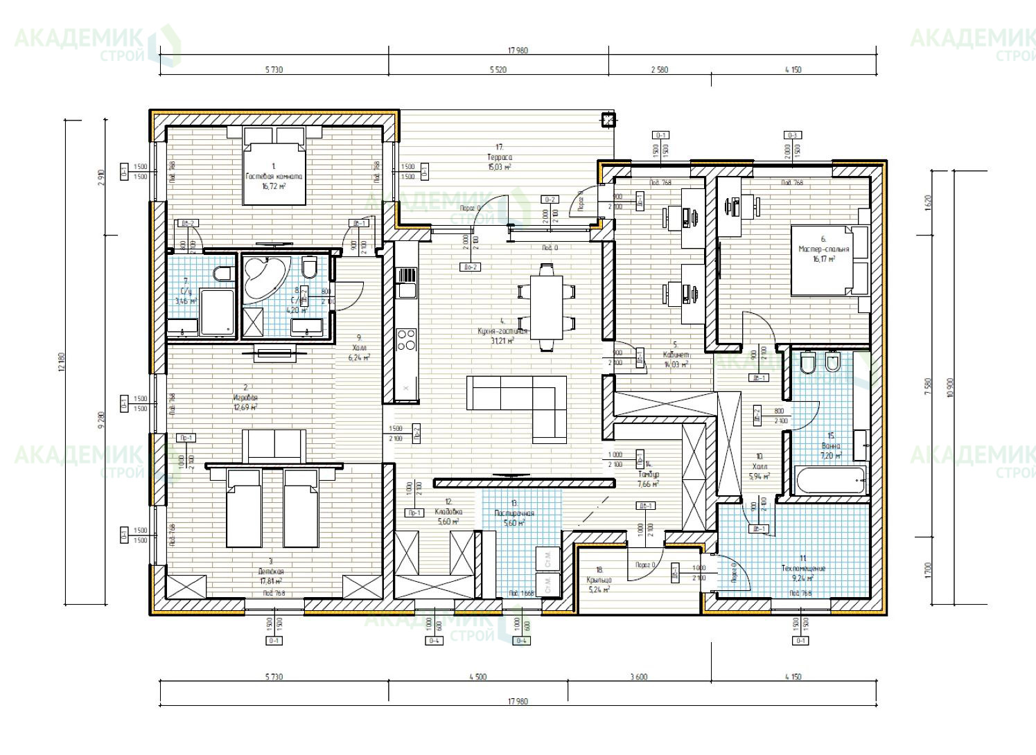 Также одноэтажная планировка предоставляет широкие возможности для зонирования общих и личных помещений. Большой зал, гостиная, кухня-столовая могут быть объединены или разделены перегородками в зависимости от предпочтений домовладельцев, что позволит создать как открытое, так и более интимное пространство.