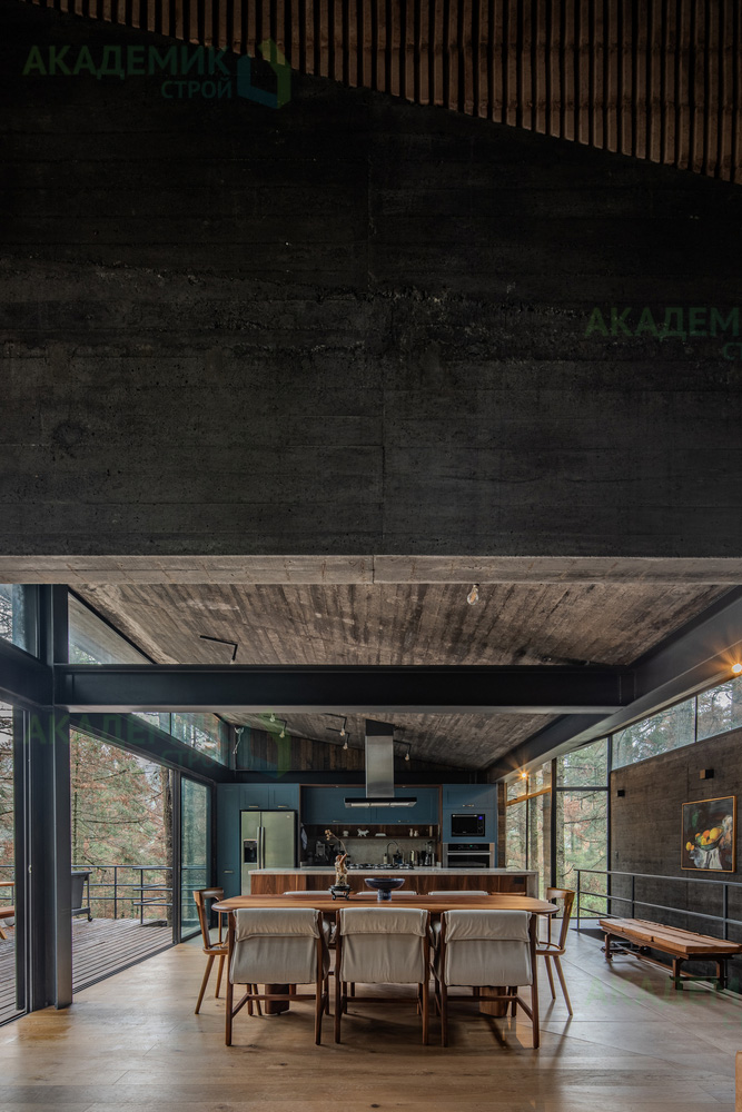 Проект «Дом 112» позволяет объединить гостиную, столовую и кухню в просторное общее пространство. Это открытая планировка, которая идеально подходит для семейных встреч и встреч с друзьями. Большие окна, направленные на участок, наполняют дом светом и создают ощущение единения с природой, что особенно ценно в загородном доме.