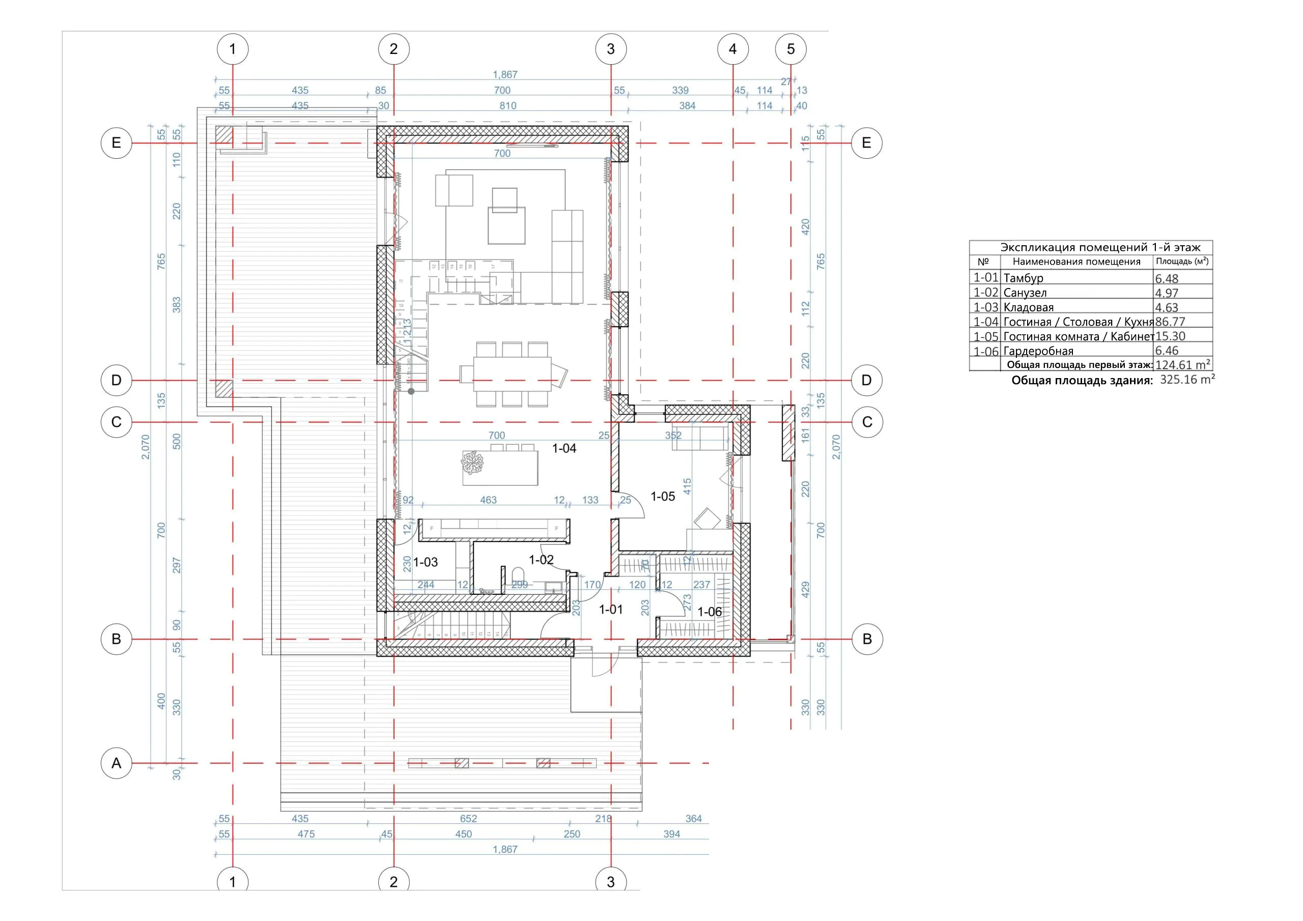 - Общая площадь первый этаж 124,61 м²