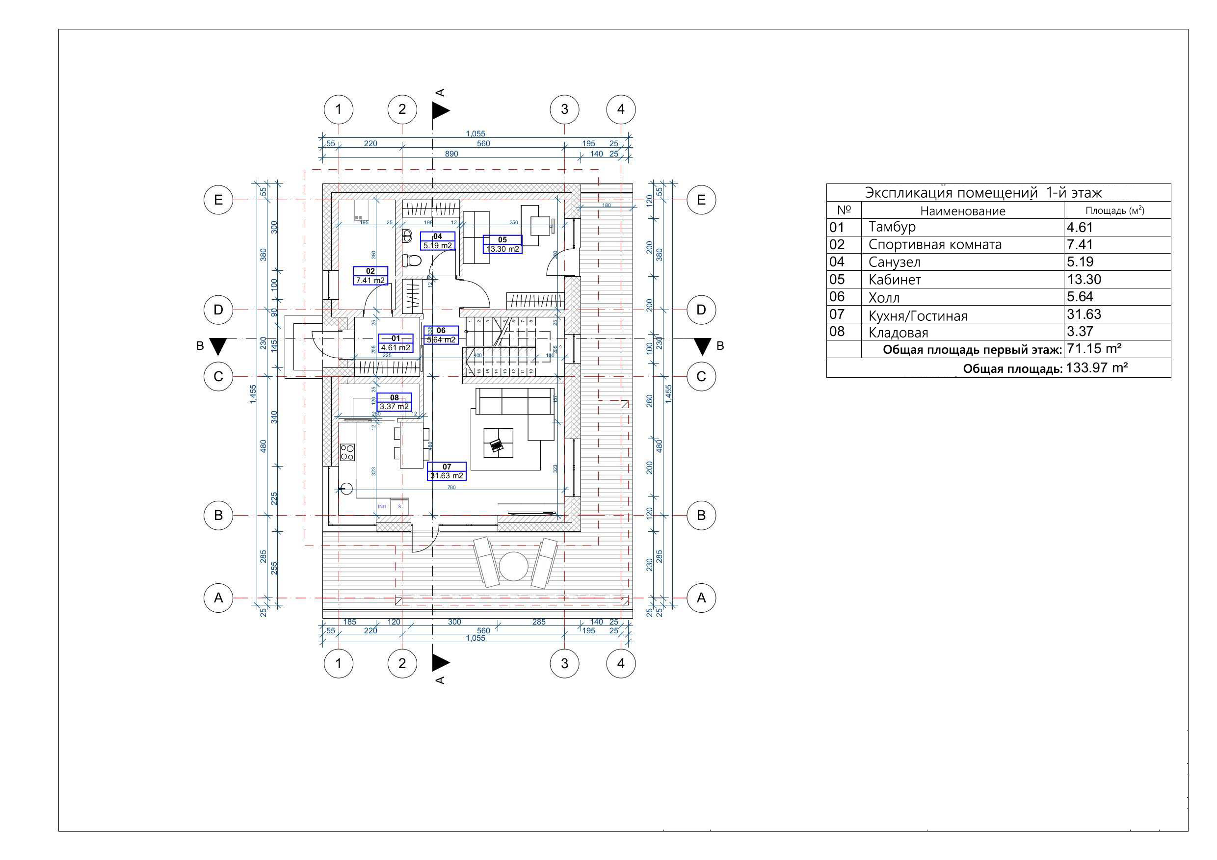 - Общая площадь первый этаж 71,15 м²