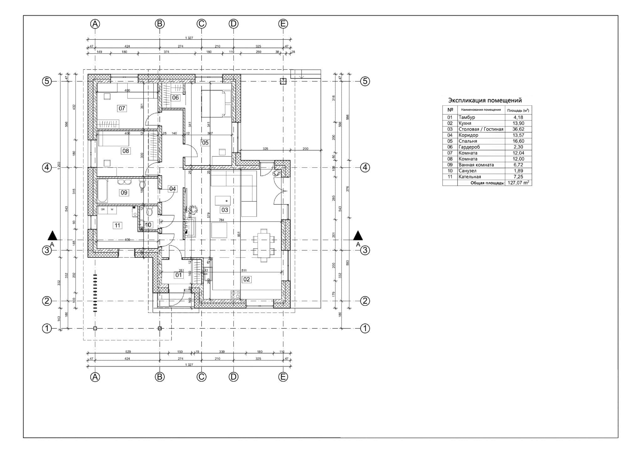 - Общая площадь первый этаж 127,07 м²