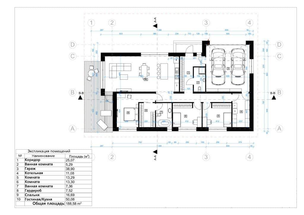 - Общая площадь первый этаж 188,58 м²