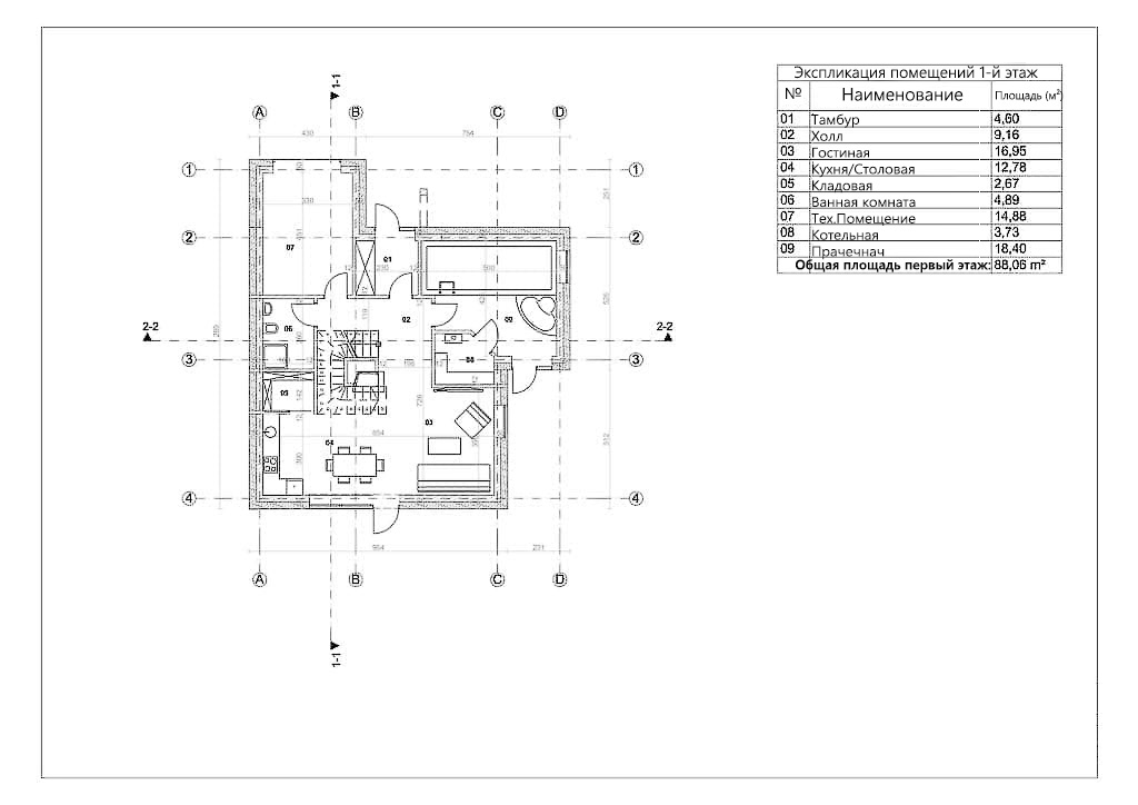 - Общая площадь первый этаж 88,06 м²